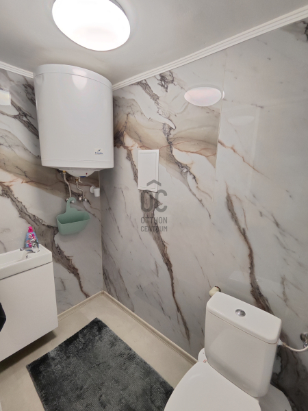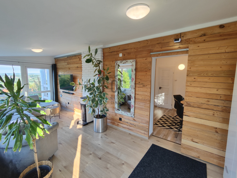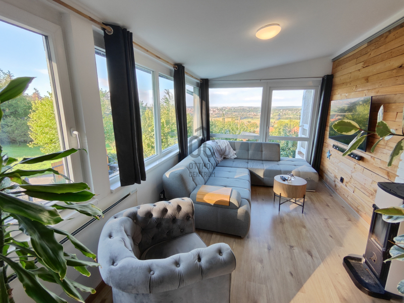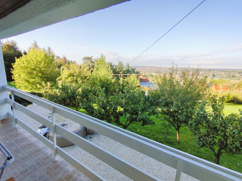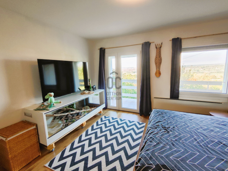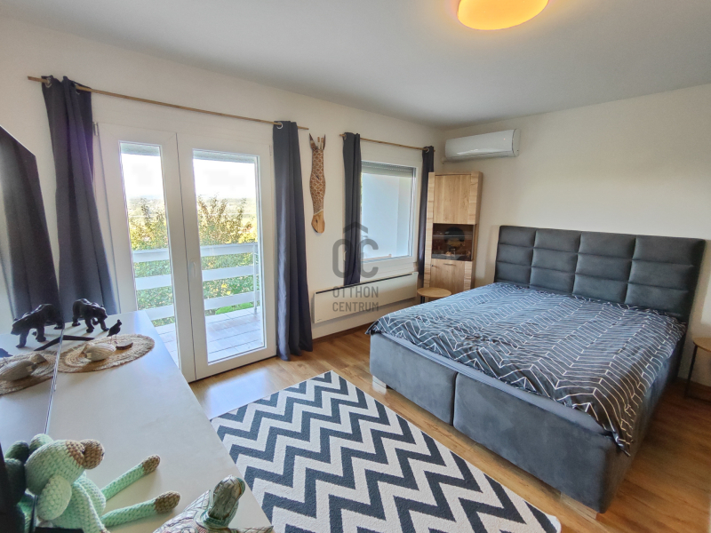 a külön kölső bejáraton megközelíthető felső szinten nagy panorámás nappali, étkező, konyha, fürdőszoba/WC illetve hálószoba és erkély kapott helyet.