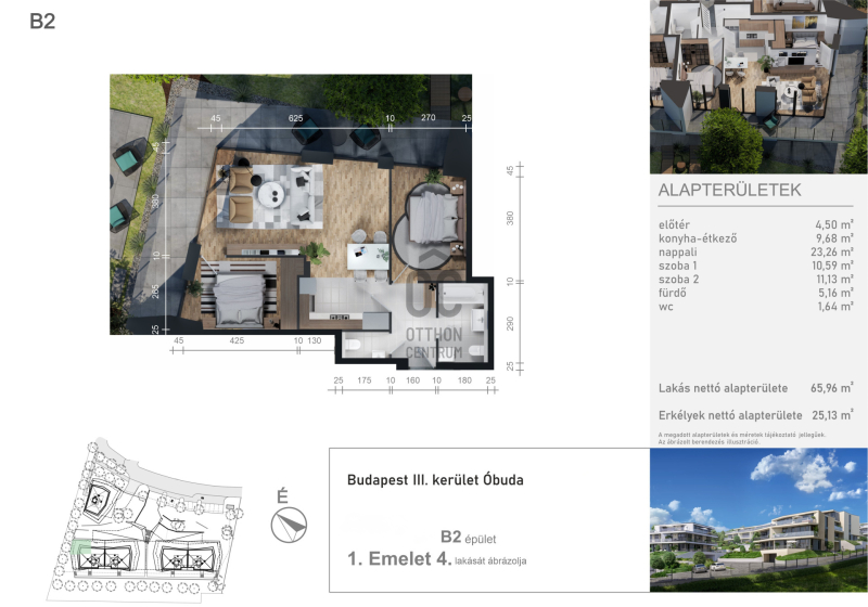 Az ingatlan nettó alapterülete 65,96 m² + 25,13 m² terasz.