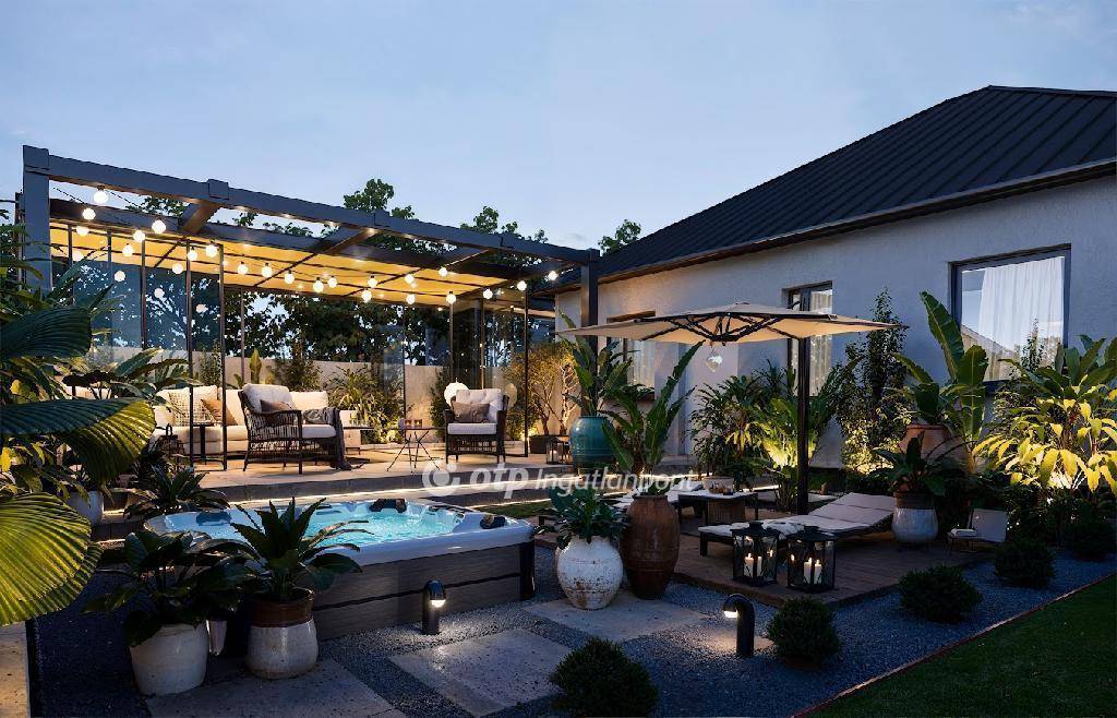 A látványterv egy mediterrán hangulatú, tágas télikertes nappalit, jakuzzis kültéri pihenőrészt és harmonikusan kialakított kertet mutat be ? ahol a ház és a természet valóban összefonódik.