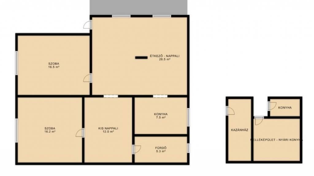 Az ingatlan belső elosztása: tágas nappali étkező - konyha, kis nappali, 2 különnyíló szoba, fürdő.