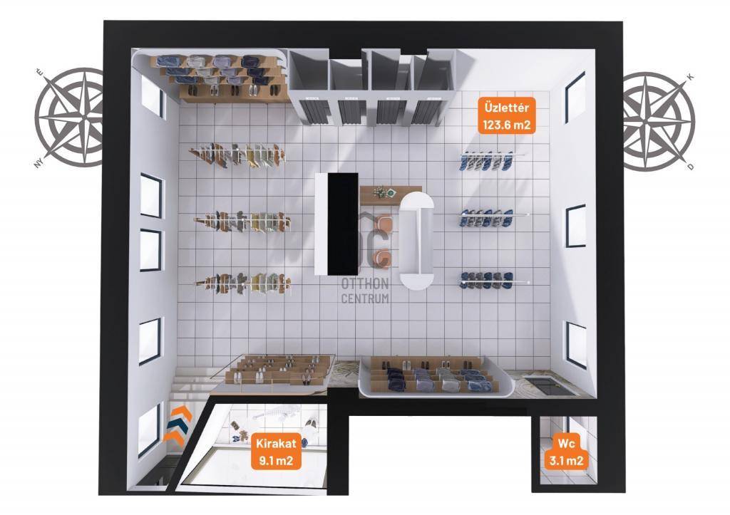 Praktikus kialakítás: a 136 m²-es tér egy tágas eladótérből áll, melyből leválasztásra került egy mosdó helyiség – így minden szükséges funkció rendelkezésre áll egy üzlet vagy iroda működtetéséhez.
