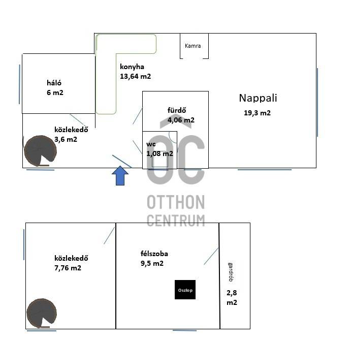 Tágas és fényes nappalin kívül 2 háló található, gardrób, kamra, külön álló wc, fürdő, és egy konyha. Autóbeálló, kertrész és egy különálló melléképület tartozik a lakórészhez. A kertrész kerítéssel leválasztott, elektromos kapu található a kocsibeállóhoz. A ház melegét kondenzációs kombi gázkazán biztosítja, radiátoros hőleadókkal.