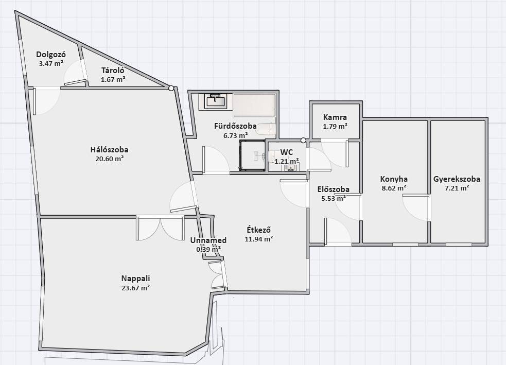 A két nagy szoba saját bejárattal rendelkezik, az egyik félszoba a konyhán keresztül közelíthető meg, míg a másik félszoba az egyik nagy szobából nyílik.