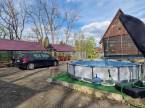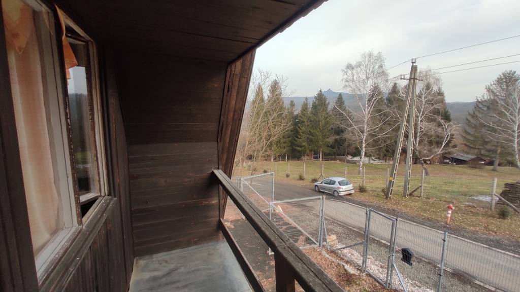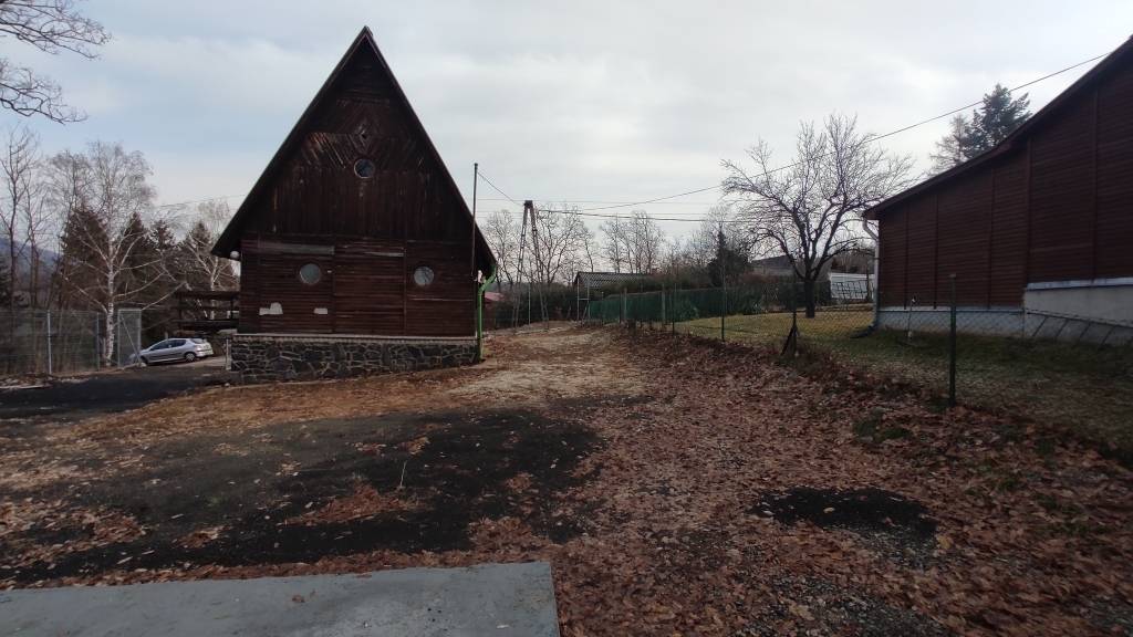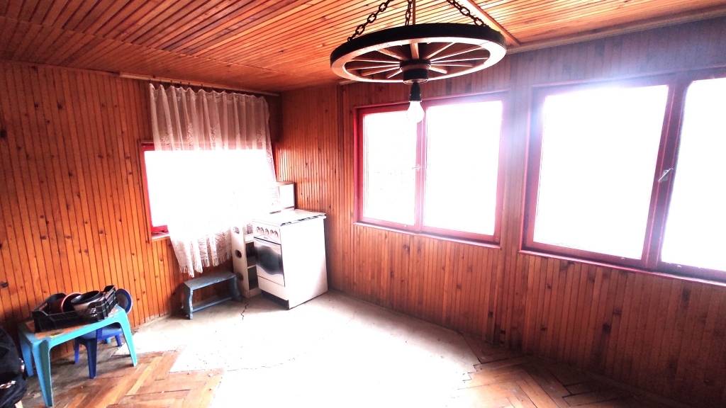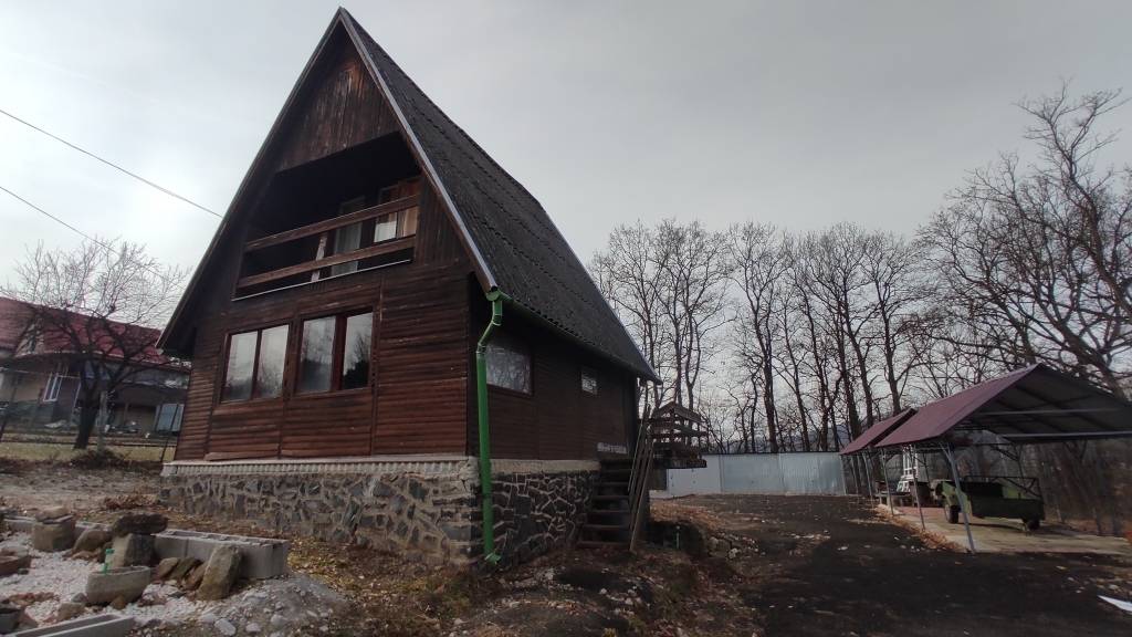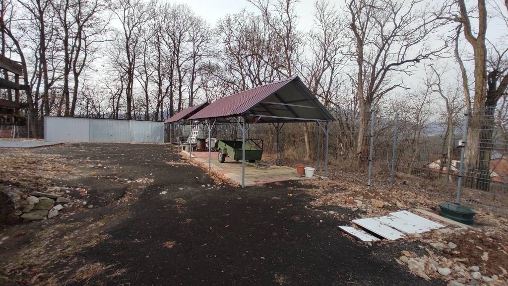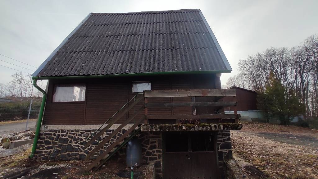 Az ingatlanon egy kő alapzatú, három plusz egy szintes, felújítandó erkélyes faház -többek közt-fürdőszobával és garázzsal, további három darab mobil garázs+ két fedett pihenőhely található.