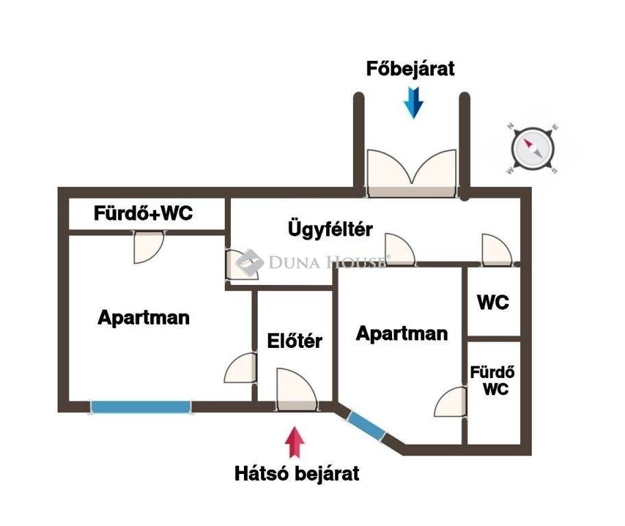 - Jelenlegi kialakítás: 1 recepciós tér + 2 teljesen felszerelt apartman