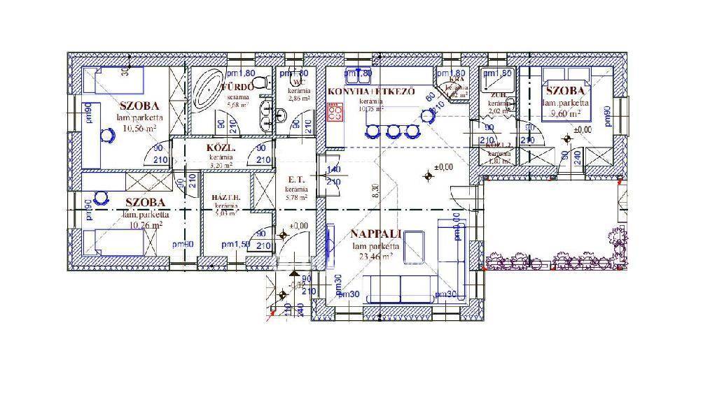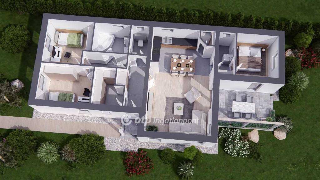 A tervezésnek köszönhetően a legélhetőbb tereket sikerült megvalósítani, ami eredményeként egy nagyméretű nappali-konyha-étkező, három hálószoba, 1 fürdő, egy háztartási helyiség, 1 vendégmosdó, valamint a kamra kapott helyet. A mindegyik oldalról körbekerített telken belül több autó részére nyitott parkolóhely kerül kialakításra.