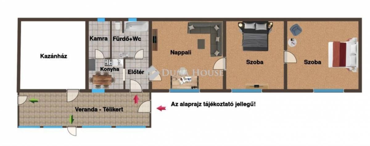 Elrendezés: előszoba, konyha-étkező, kamra, fürdőszoba, nappali, 2 szoba (egymásból nyíló) + hangulatos fűtött télikert