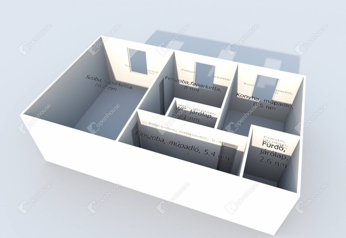 A konyha és az előtér műpadló, a WC és a fürdő járólap borítást kapott. A szobák faparkettásak.