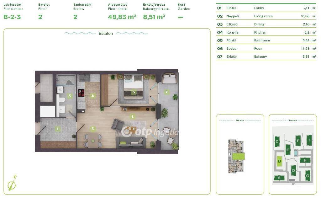 Balaton Déli part, Balatonszemes, közvetlen vízparti, 54 m2 lakás eladó. Az ingatlan a Balaton egyik legszebb vízparti lakóparkjában, természetes zöld környezetben található. A környezettudatosan épült, panorámás kilátást nyújtó, modern épületek esztétikailag és a fenntarthatóság szempontjából is kiemelkedőek, egyszerre biztosítják a kényelmes otthont és a balatoni életstílust. A különböző lakástípusok lehetőséget adnak arra, hogy minden lakó megtalálja a számára tökéletes otthont, akár az Otthon Start Hitelprogram keretében is. A földszinti lakások terasszal és kertkapcsolattal rendelkeznek, az épületek felső emeletén penthouse lakás került kialakításra. Ehhez az 50 m2-es 2. emeleti lakáshoz kis tároló és egy 9 m2-es erkély tartozik. A lakópark nem csak elhelyezkedése miatt egyedi, minden egyes lakás a legújabb intelligens technológiával, magas minőségű és igényes alapanyagokkal, prémium extrákkal kerül kialakításra. Egyszerre komfortosak és energiahatékonyak: elektromos redőnyök, szúnyogháló, egyedileg vezérelhető hőszivattyús, fan-coilos hűtési és fűtési rendszer, okosotthon rendszer, beléptető rendszer, riasztórendszer. Az ingatlan értékét növelik a következő szolgáltatások: a területen kialakított gondnoki, üzemeltetési iroda; zöldterületbe illesztett játszótér; zárt, privát vízpart több, mint 130 méteren; partmenti stég; közel 120 m2 vízfelületű strandmedence 16 m2-es gyermekpancsolóval; automata öntözőhálózat a lakóépületek közötti zöldfelületek öntözésére. OTP Ingatlanpont és Pénzügyi Pont irodánk teljeskörű támogatást nyújt az ingatlan kiválasztásával, megvételével, biztosításával és finanszírozásával, akár egyedi kedvezményes hitelekkel, befektetési lehetőségekkel kapcsolatban is. Bővebb információért keressen telefonon!