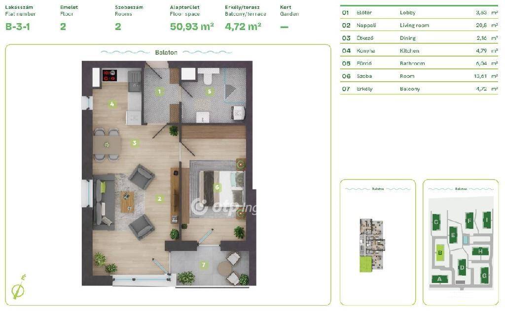Balaton Déli part, Balatonszemes, közvetlen vízparti, 61 m2 lakás eladó. Az ingatlan a Balaton egyik legszebb vízparti lakóparkjában, természetes zöld környezetben található. A környezettudatosan épült, panorámás kilátást nyújtó, modern épületek esztétikailag és a fenntarthatóság szempontjából is kiemelkedőek, egyszerre biztosítják a kényelmes otthont és a balatoni életstílust. A különböző lakástípusok lehetőséget adnak arra, hogy minden lakó megtalálja a számára tökéletes otthont, akár az Otthon Start Hitelprogram keretében is. A földszinti lakások terasszal és kertkapcsolattal rendelkeznek, az épületek felső emeletén penthouse lakás került kialakításra. Ehhez az 53 m2-es 3. emeleti lakáshoz kis tároló, 4,7 m2 erkély tartozik. A lakópark nem csak elhelyezkedése miatt egyedi, minden egyes lakás a legújabb intelligens technológiával, magas minőségű és igényes alapanyagokkal, prémium extrákkal kerül kialakításra. Egyszerre komfortosak és energiahatékonyak: elektromos redőnyök, szúnyogháló, egyedileg vezérelhető hőszivattyús, fan-coilos hűtési és fűtési rendszer, okosotthon rendszer, beléptető rendszer, riasztórendszer. Az ingatlan értékét növelik a következő szolgáltatások: a területen kialakított gondnoki, üzemeltetési iroda; zöldterületbe illesztett játszótér; zárt, privát vízpart több, mint 130 méteren; partmenti stég; közel 120 m2 vízfelületű strandmedence 16 m2-es gyermekpancsolóval; automata öntözőhálózat a lakóépületek közötti zöldfelületek öntözésére. OTP Ingatlanpont és Pénzügyi Pont irodánk teljeskörű támogatást nyújt az ingatlan kiválasztásával, megvételével, biztosításával és finanszírozásával, akár egyedi kedvezményes hitelekkel, befektetési lehetőségekkel kapcsolatban is. Bővebb információért keressen telefonon!