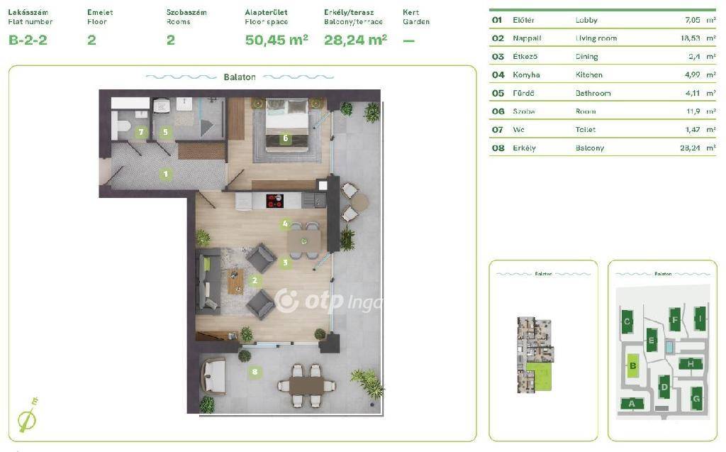 Balaton Déli part, Balatonszemes, közvetlen vízparti, 65 m2 lakás eladó. Az ingatlan a Balaton egyik legszebb vízparti lakóparkjában, természetes zöld környezetben található. A környezettudatosan épült, panorámás kilátást nyújtó, modern épületek esztétikailag és a fenntarthatóság szempontjából is kiemelkedőek, egyszerre biztosítják a kényelmes otthont és a balatoni életstílust. A különböző lakástípusok lehetőséget adnak arra, hogy minden lakó megtalálja a számára tökéletes otthont, akár az Otthon Start Hitelprogram keretében is. A földszinti lakások terasszal és kertkapcsolattal rendelkeznek, az épületek felső emeletén penthouse lakás került kialakításra. Ehhez az 51 m2-es 2. emeleti lakáshoz kis tároló és egy 28 m2-es erkély tartozik. A lakópark nem csak elhelyezkedése miatt egyedi, minden egyes lakás a legújabb intelligens technológiával, magas minőségű és igényes alapanyagokkal, prémium extrákkal kerül kialakításra. Egyszerre komfortosak és energiahatékonyak: elektromos redőnyök, szúnyogháló, egyedileg vezérelhető hőszivattyús, fan-coilos hűtési és fűtési rendszer, okosotthon rendszer, beléptető rendszer, riasztórendszer. Az ingatlan értékét növelik a következő szolgáltatások: a területen kialakított gondnoki, üzemeltetési iroda; zöldterületbe illesztett játszótér; zárt, privát vízpart több, mint 130 méteren; partmenti stég; közel 120 m2 vízfelületű strandmedence 16 m2-es gyermekpancsolóval; automata öntözőhálózat a lakóépületek közötti zöldfelületek öntözésére. OTP Ingatlanpont és Pénzügyi Pont irodánk teljeskörű támogatást nyújt az ingatlan kiválasztásával, megvételével, biztosításával és finanszírozásával, akár egyedi kedvezményes hitelekkel, befektetési lehetőségekkel kapcsolatban is. Bővebb információért keressen telefonon!