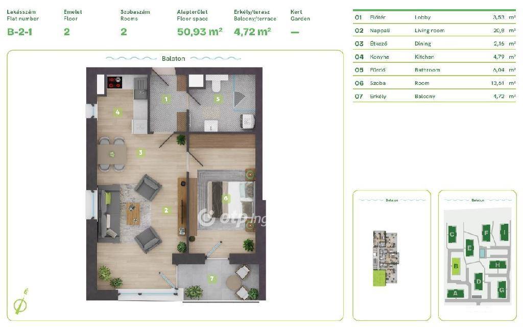 Balaton Déli part, Balatonszemes, közvetlen vízparti, 53 m2 lakás eladó. Az ingatlan a Balaton egyik legszebb vízparti lakóparkjában, természetes zöld környezetben található. A környezettudatosan épült, panorámás kilátást nyújtó, modern épületek esztétikailag és a fenntarthatóság szempontjából is kiemelkedőek, egyszerre biztosítják a kényelmes otthont és a balatoni életstílust. A különböző lakástípusok lehetőséget adnak arra, hogy minden lakó megtalálja a számára tökéletes otthont, akár az Otthon Start Hitelprogram keretében is. A földszinti lakások terasszal és kertkapcsolattal rendelkeznek, az épületek felső emeletén penthouse lakás került kialakításra. Ehhez az 51 m2-es 2. emeleti lakáshoz kis tároló és egy 5 m2-es erkély tartozik. A lakópark nem csak elhelyezkedése miatt egyedi, minden egyes lakás a legújabb intelligens technológiával, magas minőségű és igényes alapanyagokkal, prémium extrákkal kerül kialakításra. Egyszerre komfortosak és energiahatékonyak: elektromos redőnyök, szúnyogháló, egyedileg vezérelhető hőszivattyús, fan-coilos hűtési és fűtési rendszer, okosotthon rendszer, beléptető rendszer, riasztórendszer. Az ingatlan értékét növelik a következő szolgáltatások: a területen kialakított gondnoki, üzemeltetési iroda; zöldterületbe illesztett játszótér; zárt, privát vízpart több, mint 130 méteren; partmenti stég; közel 120 m2 vízfelületű strandmedence 16 m2-es gyermekpancsolóval; automata öntözőhálózat a lakóépületek közötti zöldfelületek öntözésére. OTP Ingatlanpont és Pénzügyi Pont irodánk teljeskörű támogatást nyújt az ingatlan kiválasztásával, megvételével, biztosításával és finanszírozásával, akár egyedi kedvezményes hitelekkel, befektetési lehetőségekkel kapcsolatban is. Bővebb információért keressen telefonon!