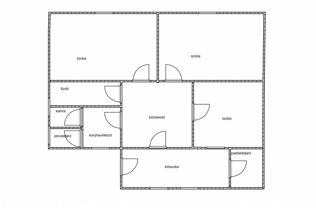 Elrendezés: Praktikus és tágas. Az alaprajz szerint a házban 3 külön nyíló, tágas szoba, egy közlekedő (vagy étkező), konyha-étkező, kamra, és egy kádas fürdőszoba egyben a WC-vel található.