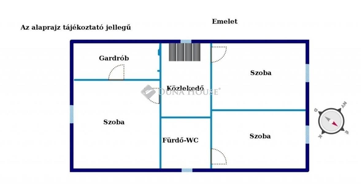 Világos közlekedőn keresztül jutunk fel az emeletre, ahol három szoba, 1 erkély, valamint fürdőszoba WC-vel + 1 gardrób is található.