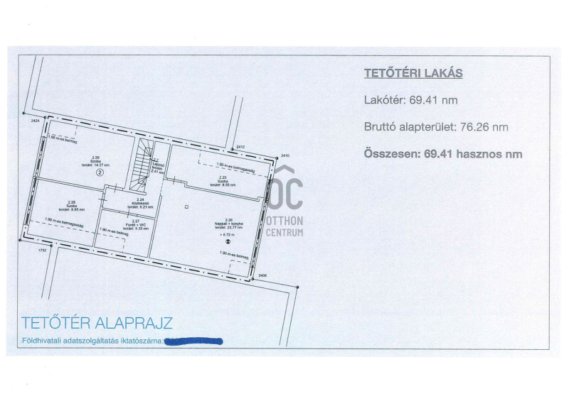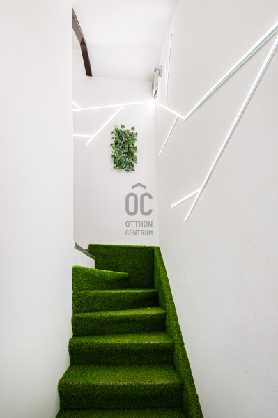 Tetőtér: nettó 69,4 m² (bruttó 76 m²), 3 szoba, nagy belmagasság, városi panoráma.