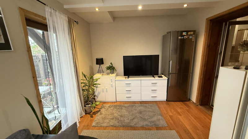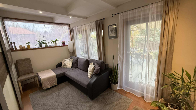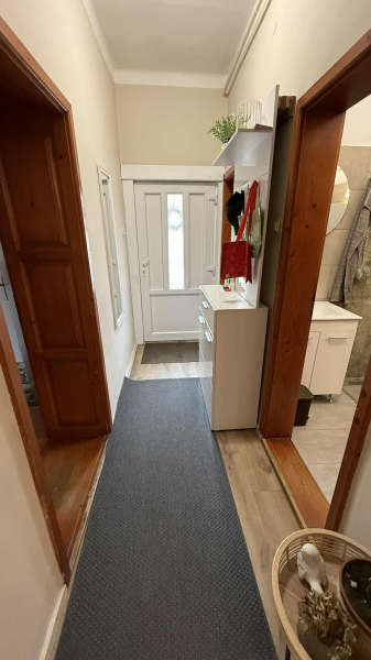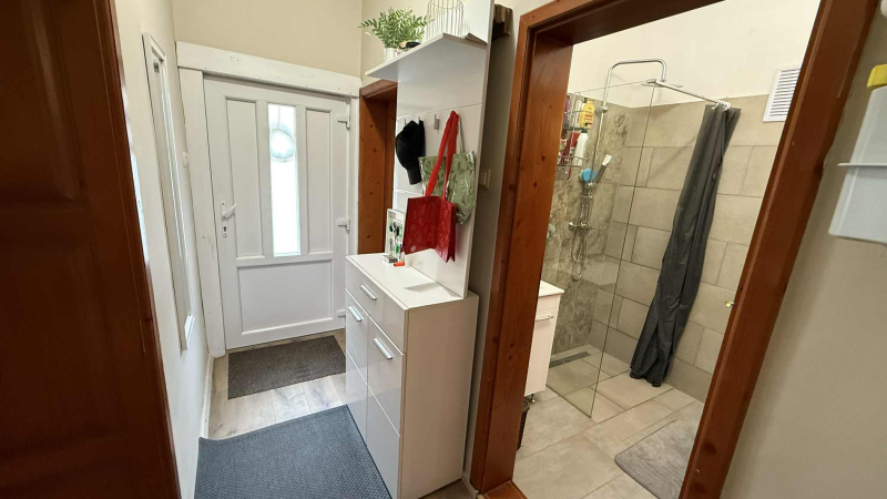 tágas,világos hálószoba,kettő félszoba,fürdőszoba zuhanyzóval,folyosó,gépesített,modern konyha és étkező,valamint egy kertre néző,világos nappali,ahonnan a fedett,hangulatos teraszra érünk.