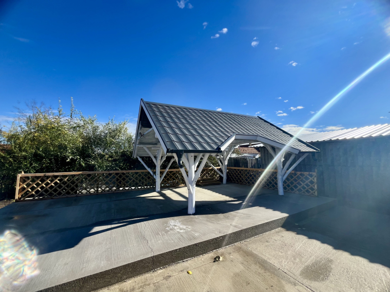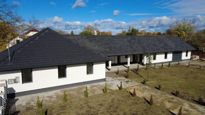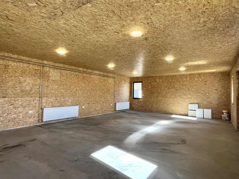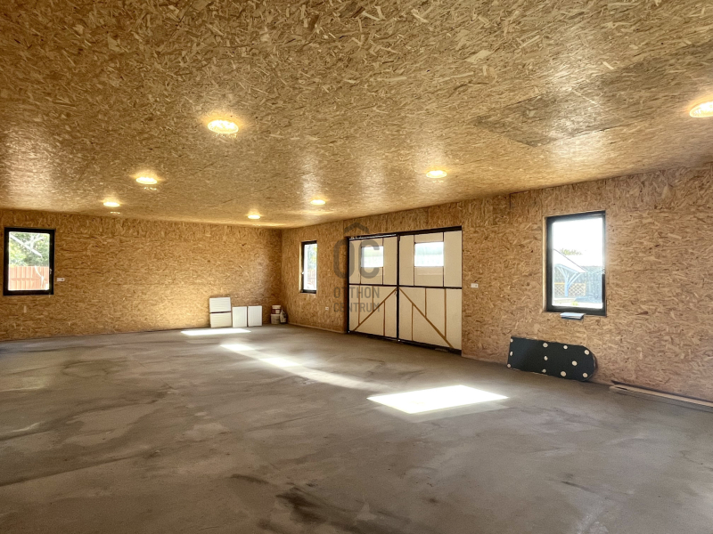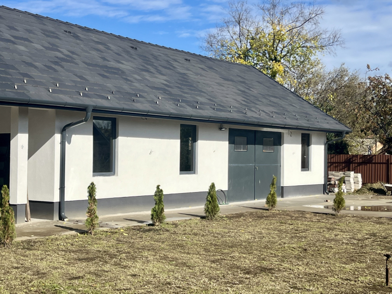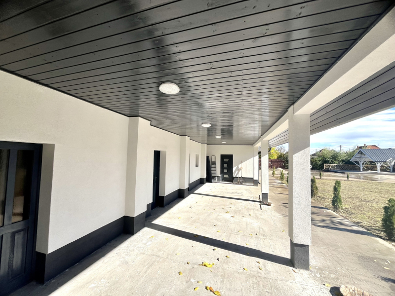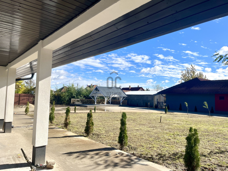 A házhoz 106 m²-es, fűthető garázs, 50 m²-es fedett tornác, valamint a kert végében szaletli tartozik.