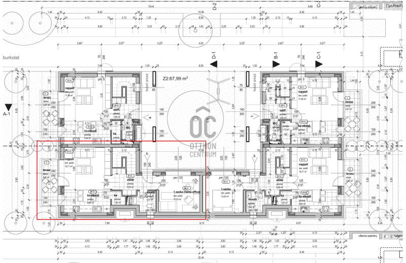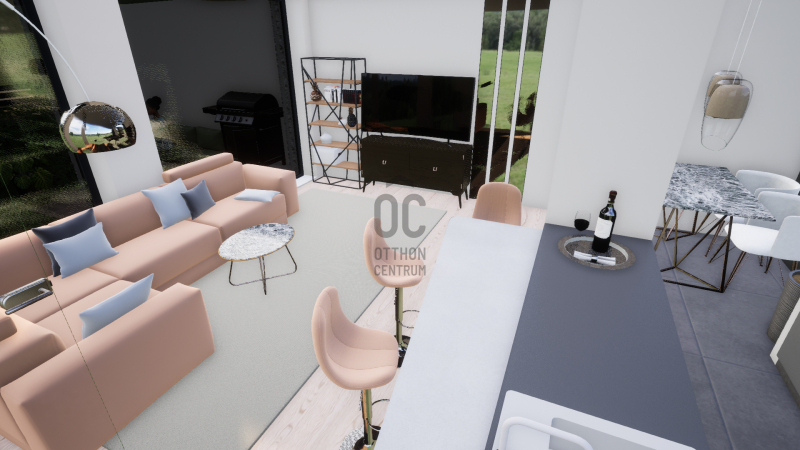 terasz kapcsolódik, mind az étkező-konyhából, mind a nappaliból önálló kijutási lehetőséget biztosítottunk a teraszra.