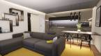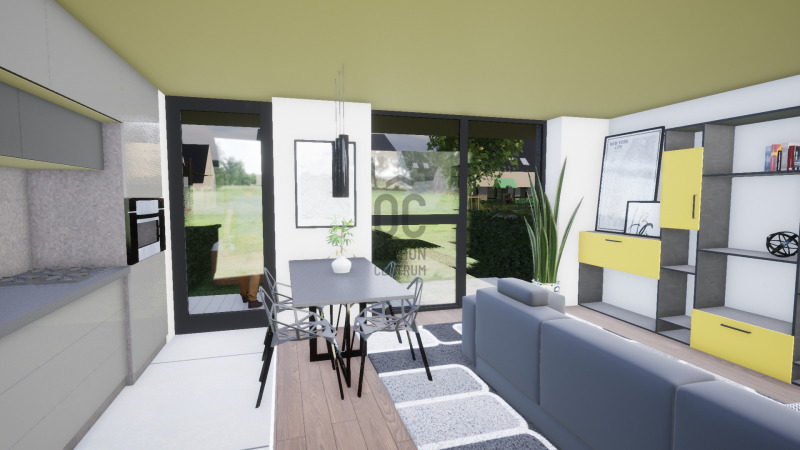 A földszinten elhelyezett étkezőkonyha és nappali összesített alapterülete meghaladja a 26 m2-t. A nappali mérete