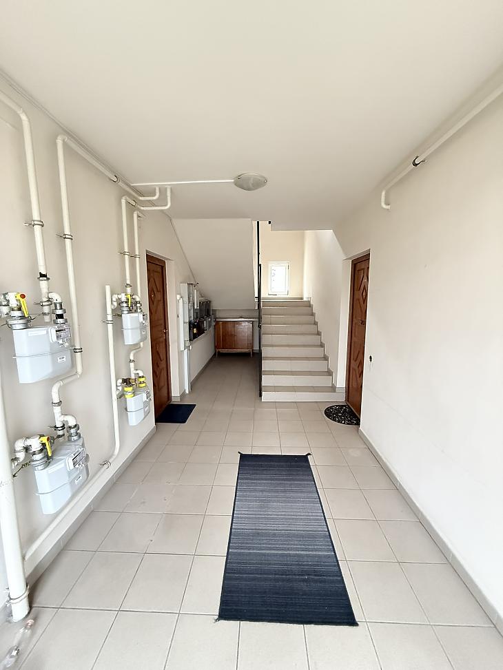 A szobák külön nyílóak, melyek laminált burkolattal rendelkeznek, a konyha és a vizes helyiségek pedig járólaposak. A lakás melegéről turbós kombi cirkó gondoskodik, egyedi méréssel. A nyílászárók az alsó szinten műanyagok a tetőtérben fából vannak és redőnnyel ellátottak. A lakás dupla komfortos alsó szinten kádas fürdőszoba található míg az emeleten zuhanyzó került beépítésre, külön mellékhelyiséggel. A beépített bútorok a vételár részét képezik.