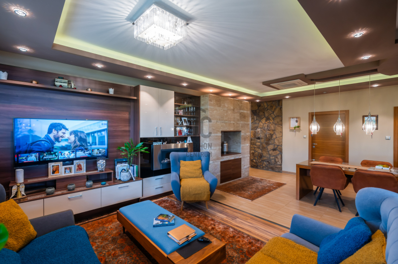 A tágas, napfényben úszó nappali, a meleg tónusú belső terek, a kézzel készített beépített bútorok, valamint az egyedi világítástechnika együttese elegáns, mégis otthonos hangulatot teremt.