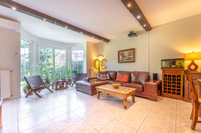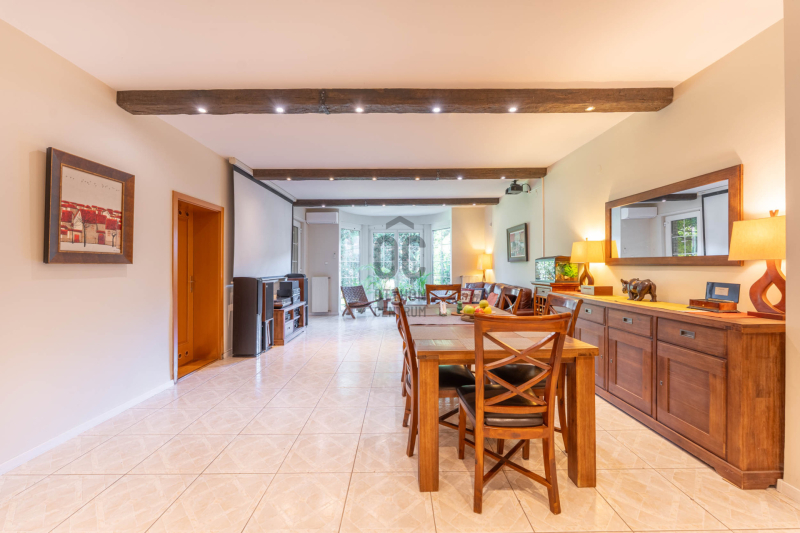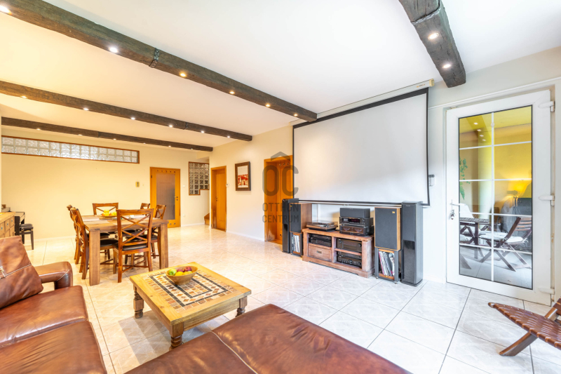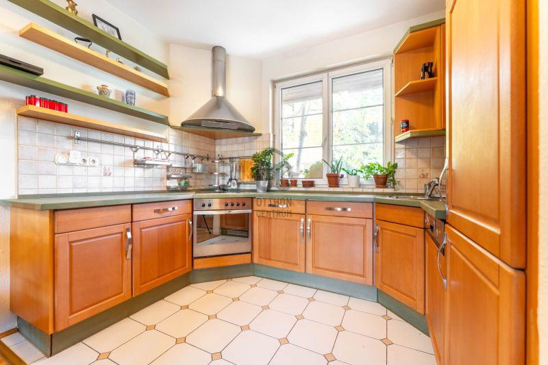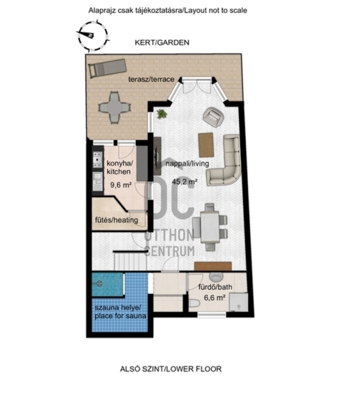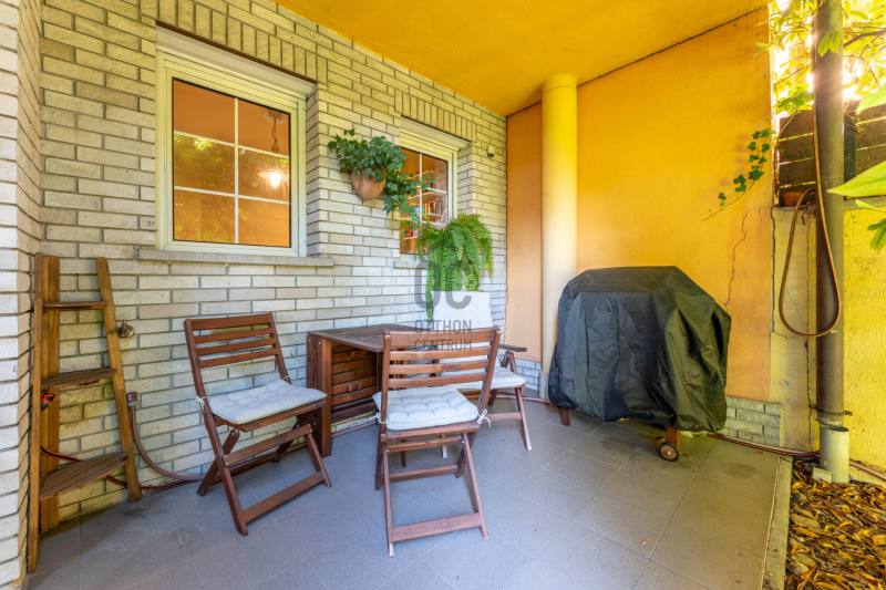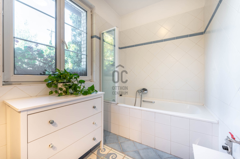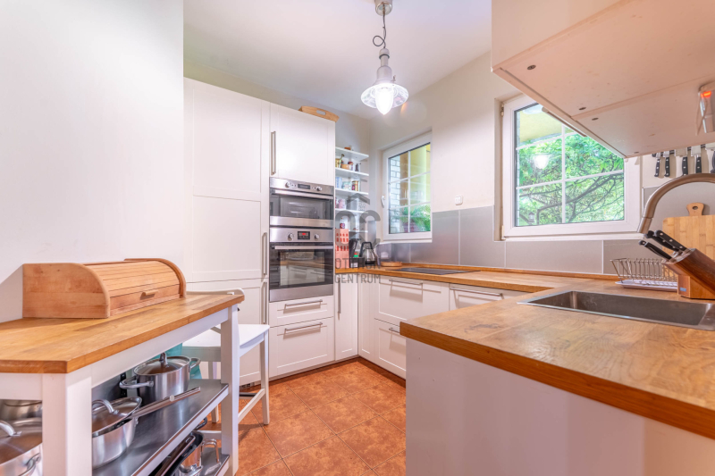 - a kert szinten tágas nappali étkezővel kertkapcsolatos terasszal, külö konyha, fürdő, hely a szaunának kiépített zuhannyal és kazánház/háztartási helyiség,