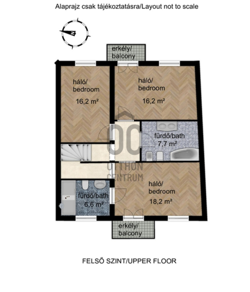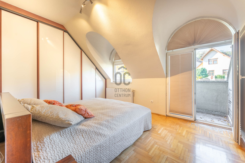 - a felső szinten 3 hálószoba, két fürdőszoba, 2 erkély.