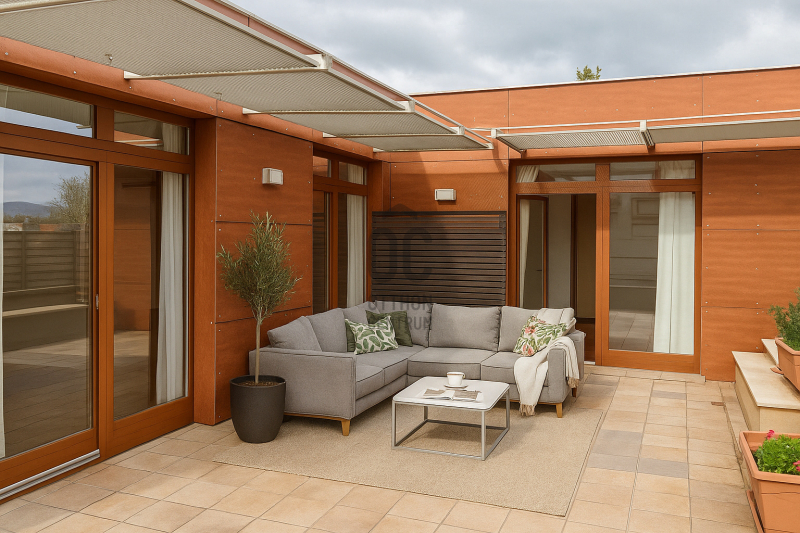 A nagy nappaliból közvetlenül kiléphetünk a közel 50 m²-es, délkeleti fekvésű tetőteraszra, amely a lakás igazi ékköve: tökéletes a reggeli kávé elfogyasztásához, pihenéshez vagy baráti estékhez.