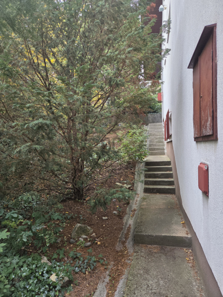 A ház - elhelyezkedését tekintve - átmenő forgalomtól mentes helyen, egy zsákutca végén található, körbekerített, parkosított telken. A második és harmadik emeletéről is szép rálátást kapunk a veszprémi Várra és várnegyedre, mely egyedi panorámát kölcsönöz a nappalinak és a szobáknak is.