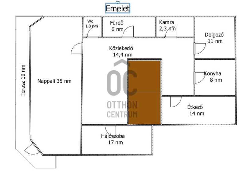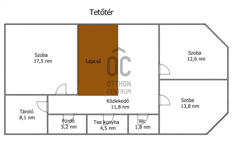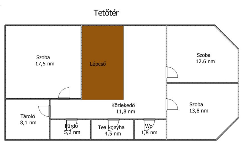 - 2.szint: 3 hálószoba, teakonyha, közlekedő, fürdőszoba, wc, tároló