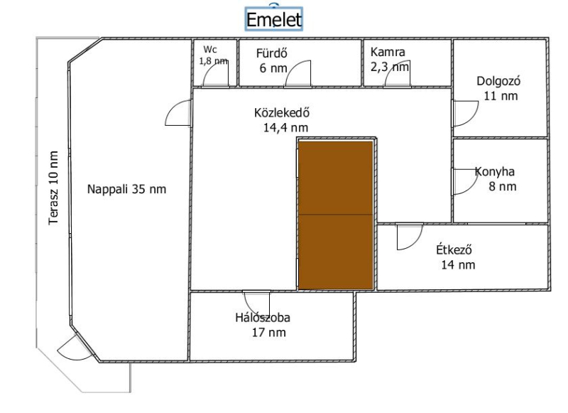 - 1. szint: közlekedő, hálószoba, nappali + terasz, wc, fürdőszoba, kamra, dolgozó szoba, konyha+ étkező közvetlen udvarkapcsolattal