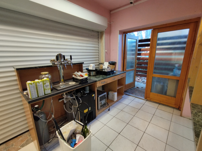 Eladótér 13 nm, előkészítő 14 nm, raktár 1,6 nm, terasz 38nm, személyzeti és vendég wc-k, kézmosók.