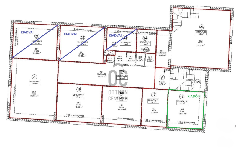 - A hirdetésben található iroda 12 m2 alapterületű, a szintrajzon a 16. számú.