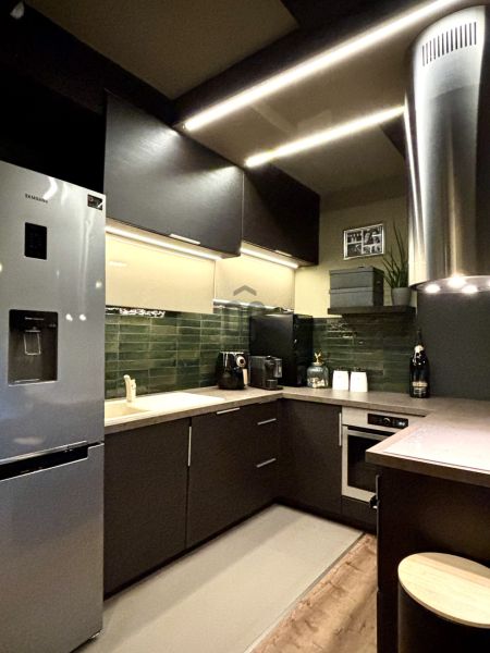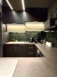 Szép konyhabútor beépített sütővel, mikróval, indukciós főzőlappal, dizájn elszívóval rendelkezik.