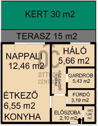 egy 38 nm-es + 15 nm-es terasszal és 30 nm-es saját kerttel rendelkező lakást.