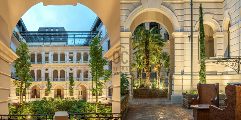 A felújított épület minden részlete a mesteri eleganciát tükrözi: márványburkolatok, míves kőfaragások, lenyűgöző homlokzat és négy különleges belső kert várja a lakókat.