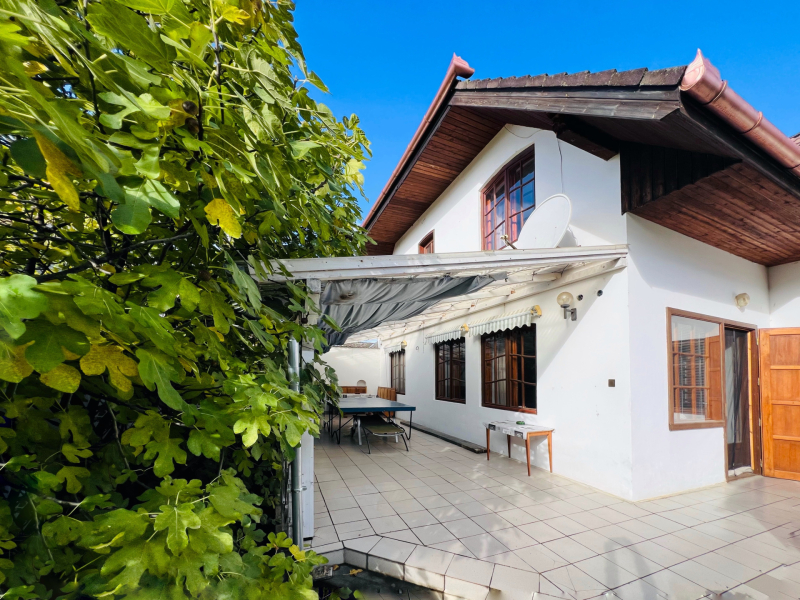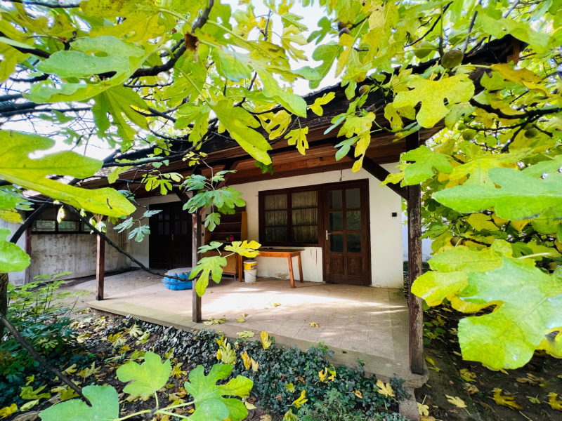 Gyümölcsfákkal tarkított (füge, cseresznye, dió, málna) árnyas kert.