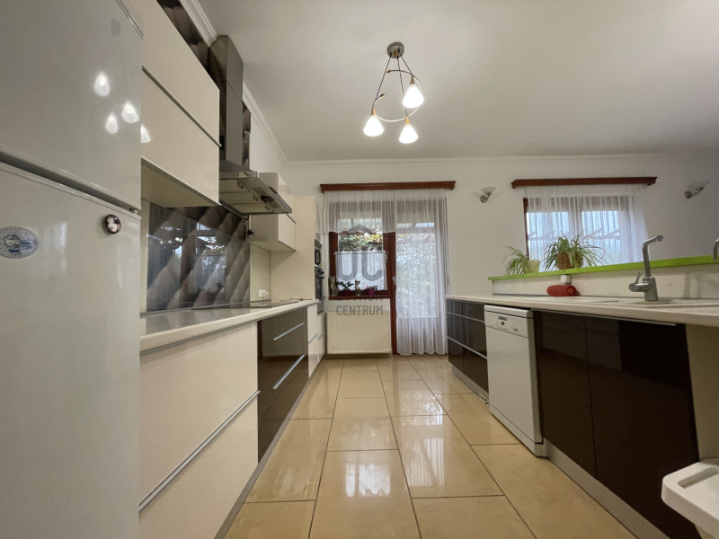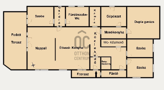 Helyiségei: hatalmas, világos, hangulatos konyha-étkező-nappali, 3 különnyíló szoba, 2 fürdőszoba (zuhanyzós és kádas), 2 wc, kamra, mosókonyha, gépészet, gardrób, dupla garázs.