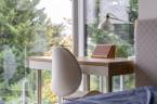 Ősszel az erdő közelsége új színt hoz: a domboldal aranyló levelei a homlokzatról visszaverődő fényekkel játszanak, a teraszról kilépve érezni a nedves föld és a lehulló levelek illatát – ez a ház ilyenkor különösen otthonos, bensőséges.