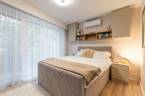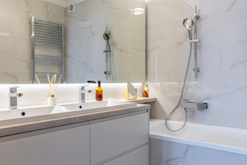A fürdőszobák márványhatású burkolatai és lágy fényei az esti rituáléknak ad letisztult, kellemes, tiszta teret.