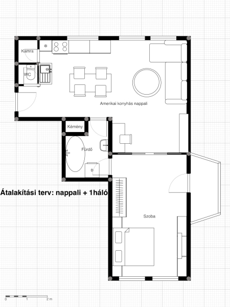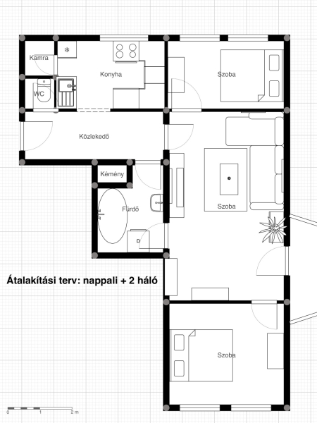 Igény esetén a két tágas szoba könnyedén nappali + 2 hálószobás elrendezéssé alakítható a kelet–északnyugati tájolásnak és bőséges természetes fénynek köszönhetően.