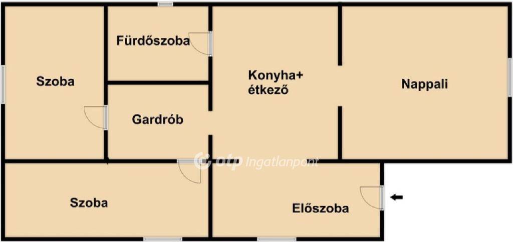 Az ingatlan helyiségei: nappali, 2 szoba, konyha étkezővel, fürdőszoba, gardrób és előszoba.
