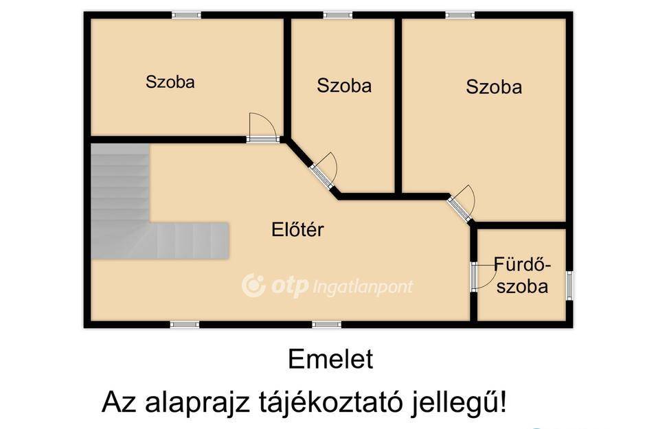 Emelet: 3 külön nyíló félszoba, fürdőszoba WC-vel egy helyiségben, közlekedő, gardrób