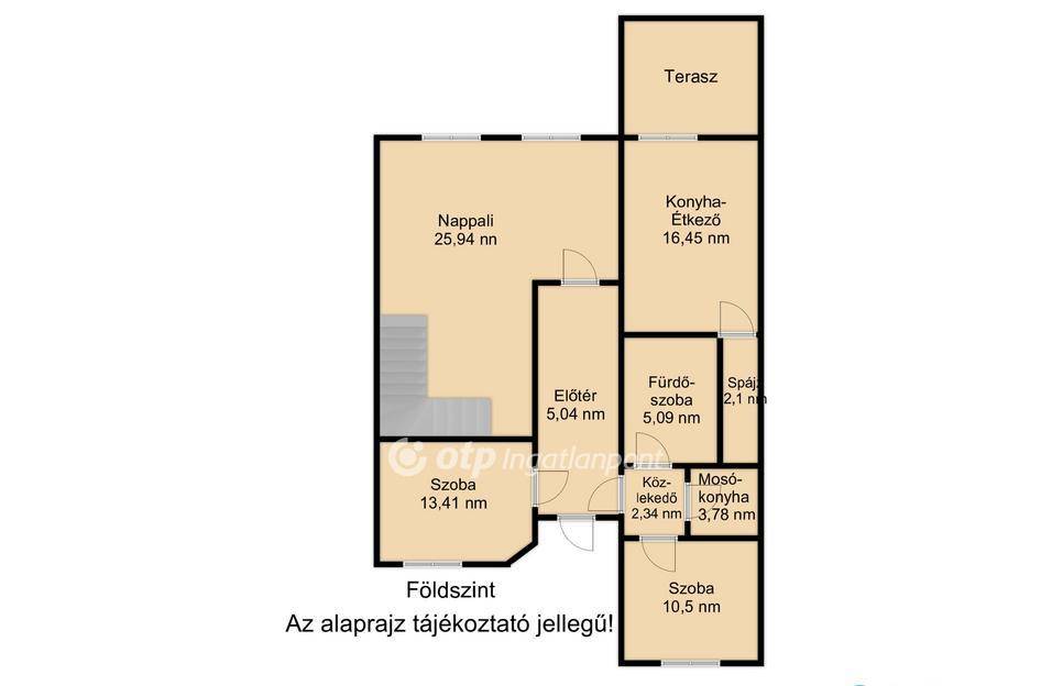 Földszint: egy tágas nappali, étkező- konyha, spájz, 1 szoba, 1 félszoba, közlekedő, fürdőszoba WC-vel, előszoba, mosókonyha, fedett terasz, lépcsőfeljáró