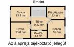 Emelet: 3 külön nyíló szoba, fürdőszoba WC-vel egy helyiségben, közlekedő, gardrób
