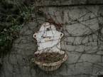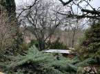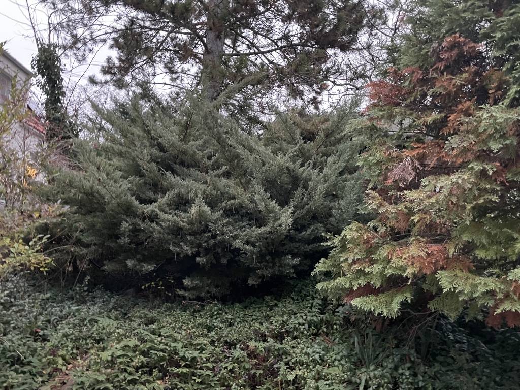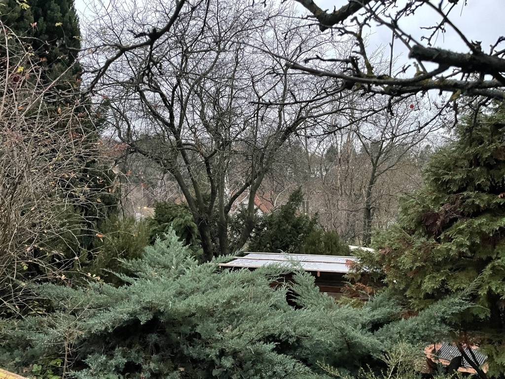 A kertben szépen megtervezett díszfák, cserjék, örökzöldek, gyümölcsfák kerti sütögető található.