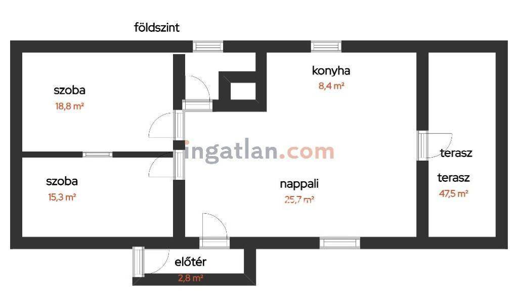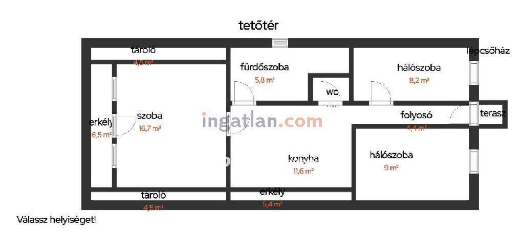 Helyiségek: földszint: előszoba, amerikai konyhás nappali, 2 szoba, fürdőszoba, külön WC, 73 m2 terasz; tetőtér: 2 db erkély, 3 szoba, konyha étkező egyben, folyosó, fürdőszoba, külön WC.
