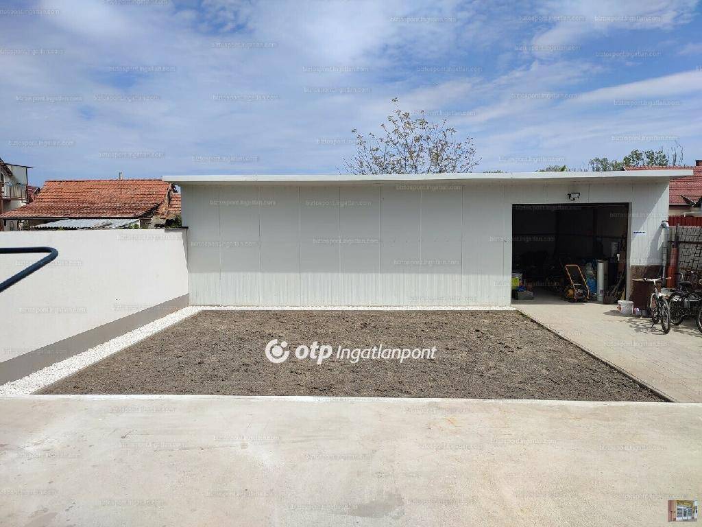 Garázs, melléképület, szendvics panelből épült elektromos ajtóval.