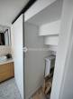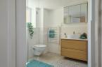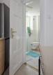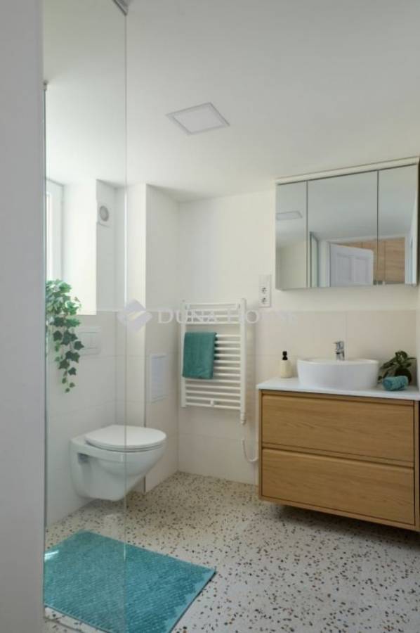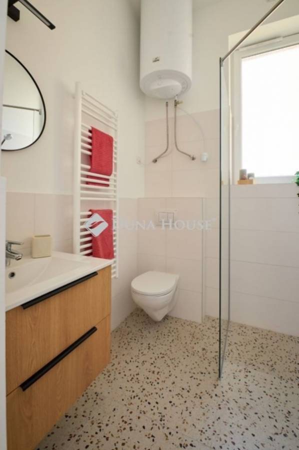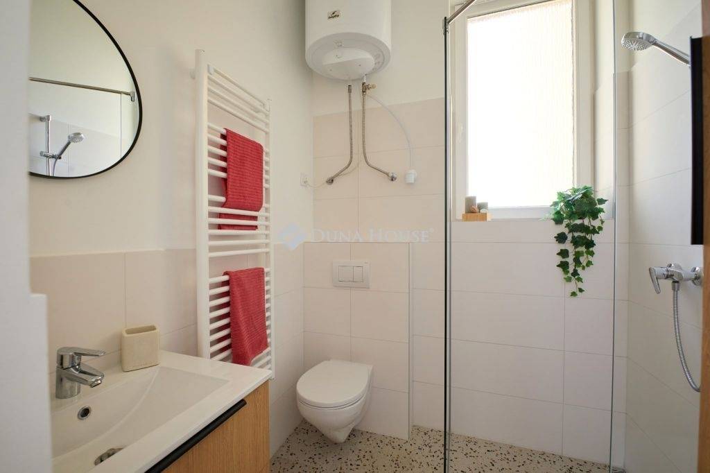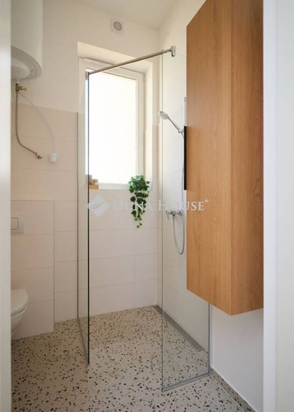 A második, szintén zuhanyzós fürdőszoba a nappaliból közelíthető meg, és mellette külön kis tároló helyiség is van a galéria lépcsője alatt. A lakás praktikus elrendezésű, minden helyiség funkcionális, a beépített tárolók pedig kifejezetten jól kihasználják a teret.