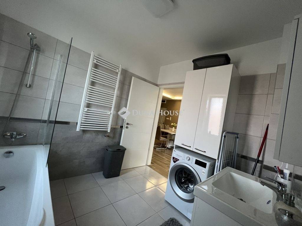 -8 m²-es fürdőszoba káddal és zuhanyzási lehetőséggel, mosógép és szárítógép helye kiépítve, szintén beépített szekrénnyel